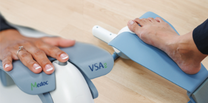Der VSA-2 (Vibratory Sensory Analyzer 2) von Medoc bietet eine hochauflösende und multifrequente Bewertung der Funktion großer sensorischer Nervenfasern für die quantitative sensorische Testung (QST). Das tragbare Gerät ist benutzerfreundlich, kann gut in der Hand gehalten werden und ermöglicht eine genaue Stimulation an verschiedenen Körperstellen. Dank der optionalen ergonomischen Hand-Fuß-Stütze ist der VSA-2 auch stationär einsetzbar. Das Gerät arbeitet unabhängig von der Körperposition oder der Geräteausrichtung mit einem konstanten Druck und bietet somit zuverlässige Ergebnisse.